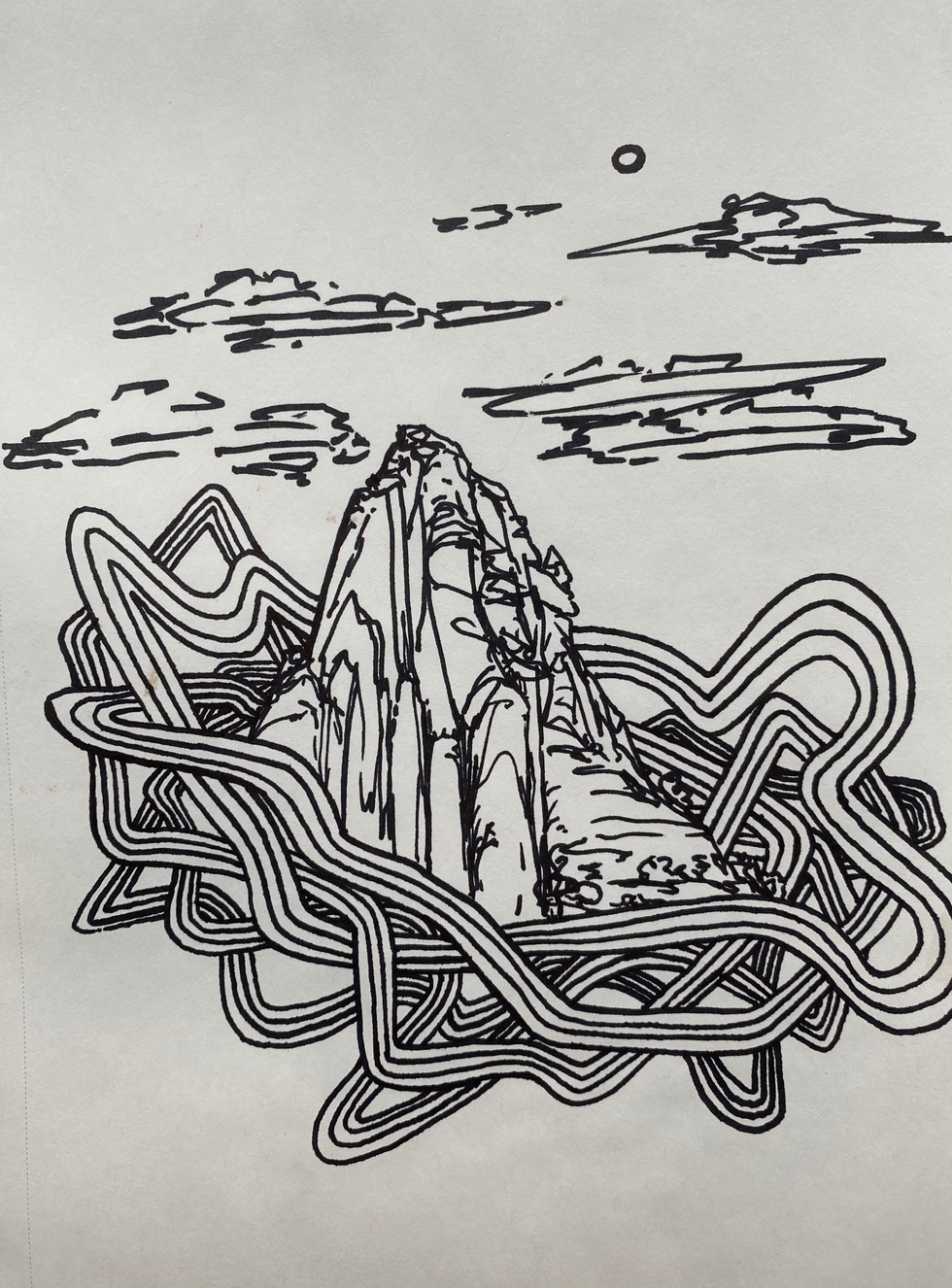 A collection of hand-drawn psychedelic mountain landscapes, and desert scenes, featuring native vegetation, distant memories of better days and swirling lines.